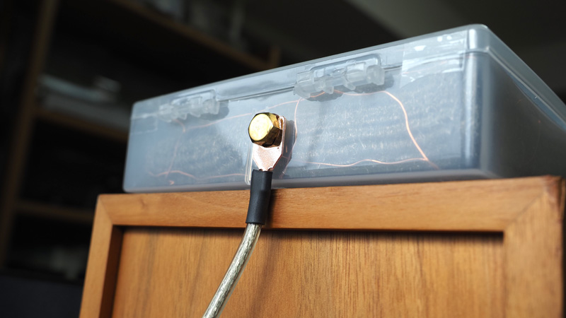 そしてプラケースの内側に銅針金のケージを作ります。線径0.55mmを選びましたが作業性やターミナルに締め付けることを考えるともう少し細くても良いかも。セロハンテープでケースに仮止めしながら約2mを使って張り巡らせました。