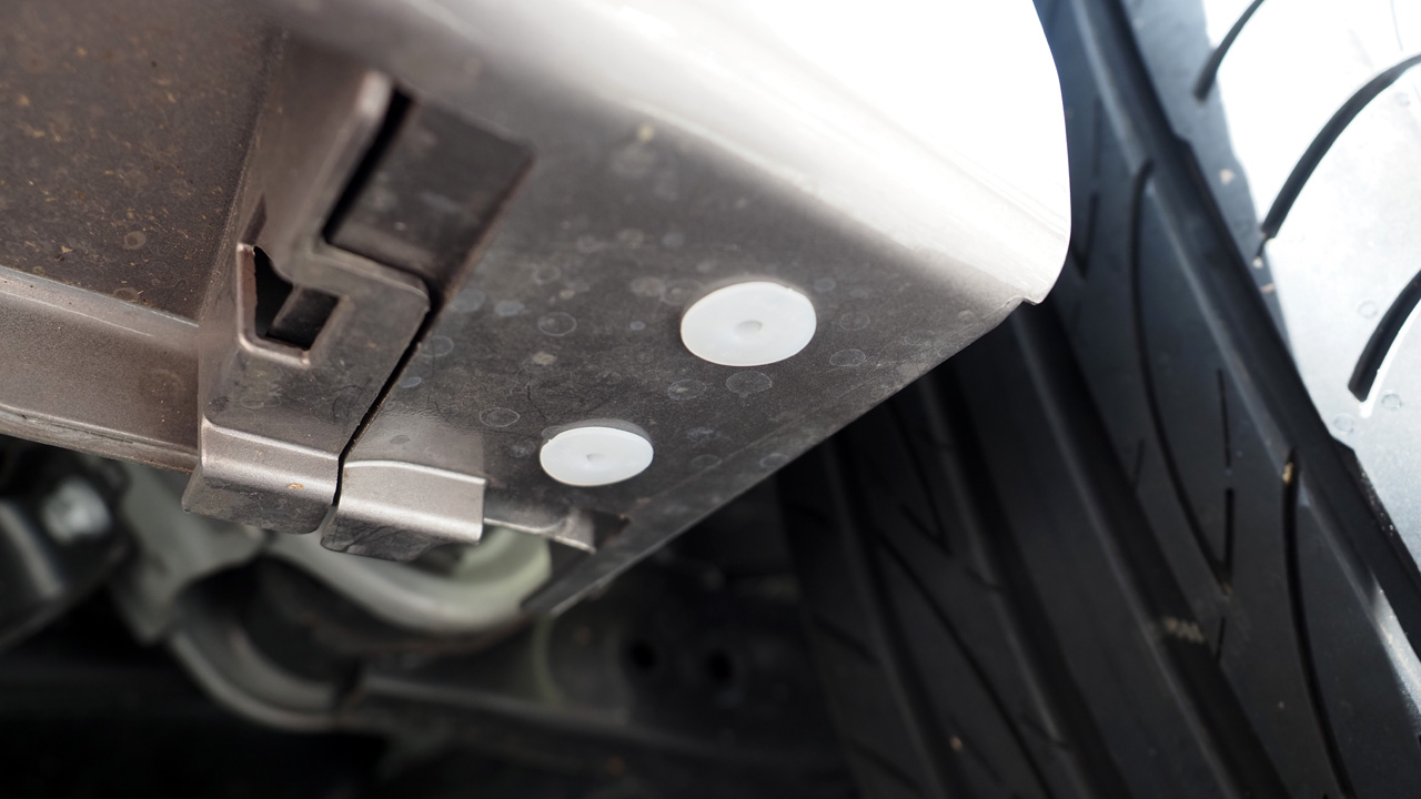 まずは地面に寝そべってリヤホイールアーチ前の底面にある2つの四角い穴にグロメット(白パーツ)を差し込みます。